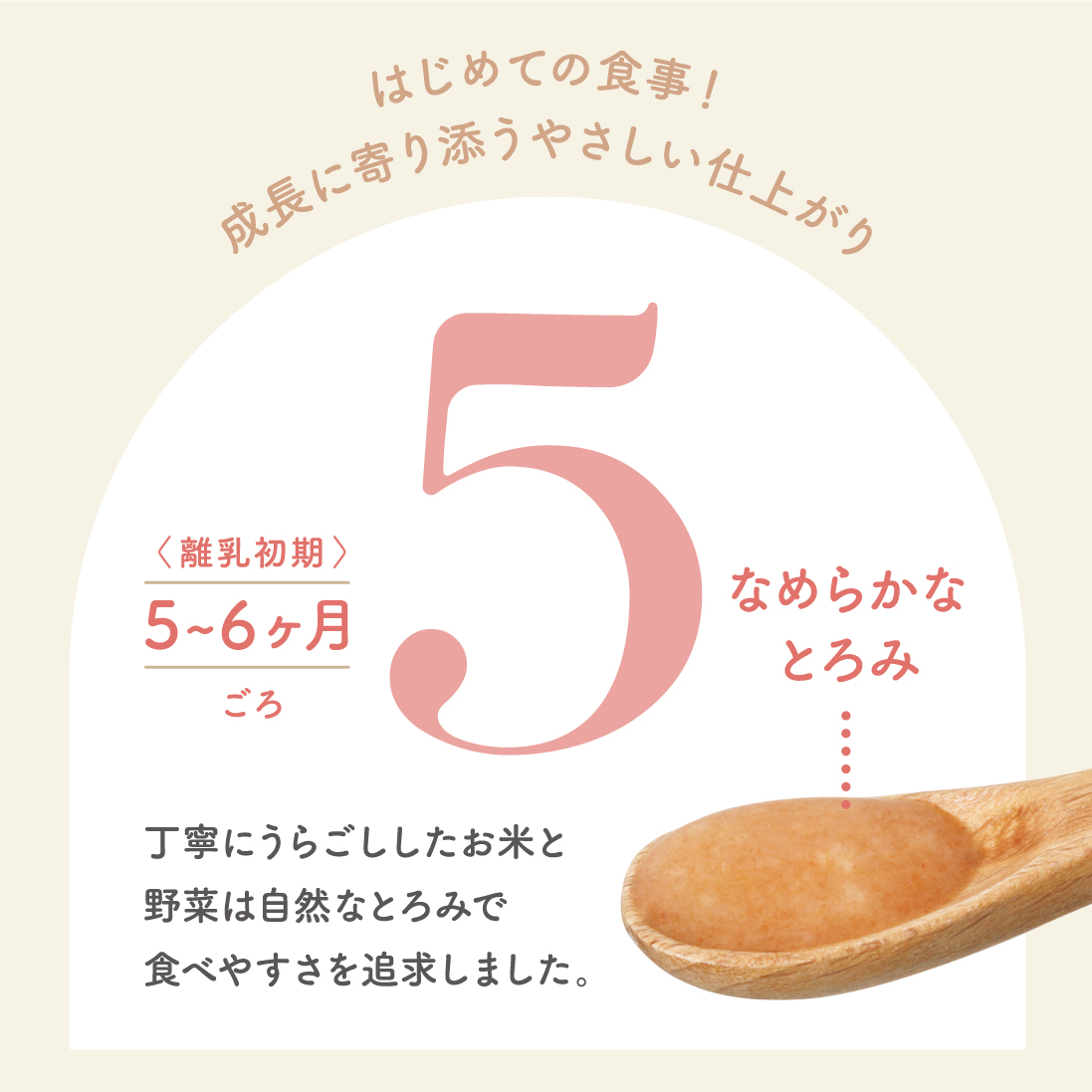 たまねぎ、じゃがいも、鶏肉の抜群の相性。積極的に食べさせたい「レバー」も加え、赤ちゃんに味わいに慣れてもらうことを目指しています。美味しさがぎゅっと詰まった、満足感のある仕上がりです。固形の野菜に慣れていなくても食べやすいよう、やわらかく調理しています。