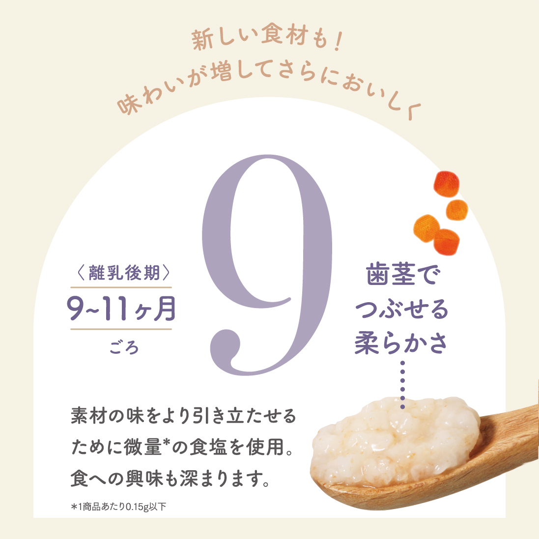 たまねぎ、じゃがいも、鶏肉の抜群の相性。積極的に食べさせたい「レバー」も加え、赤ちゃんに味わいに慣れてもらうことを目指しています。美味しさがぎゅっと詰まった、満足感のある仕上がりです。固形の野菜に慣れていなくても食べやすいよう、やわらかく調理しています。